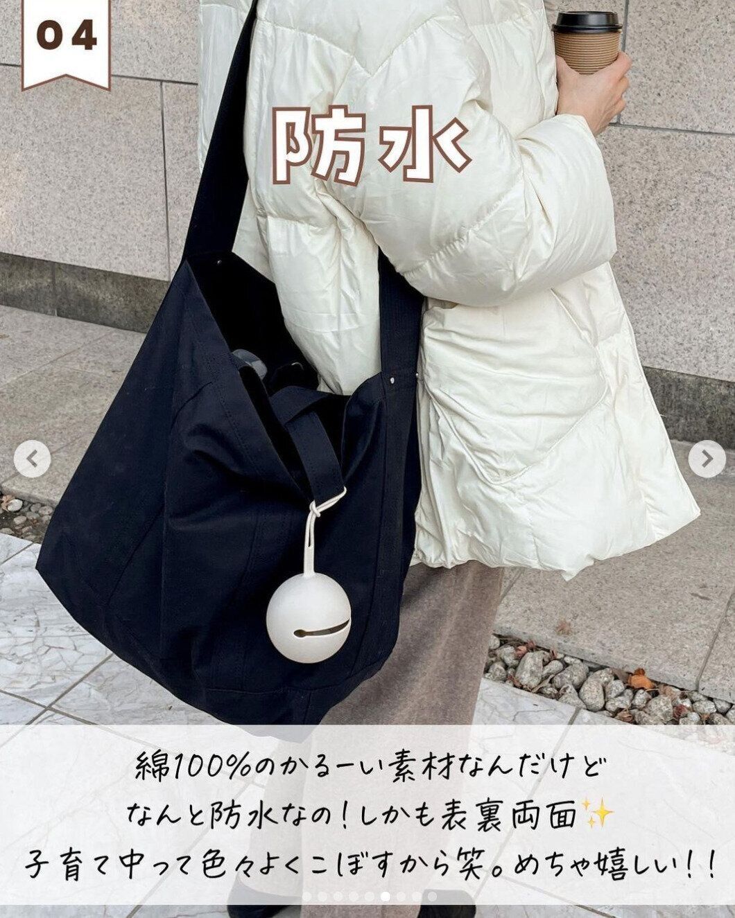 こちらはsachiko917さんが愛用しているMATO by MARLMARL(マトー バイ マールマール)の「防水2wayペアレンツトートバッグ」。底が広いのでたくさん入れても中のものが探しやすいのだそう。抱っこ紐の肩ベルトに固定でき、肩からずり落ちない工夫までされているんだとか◎