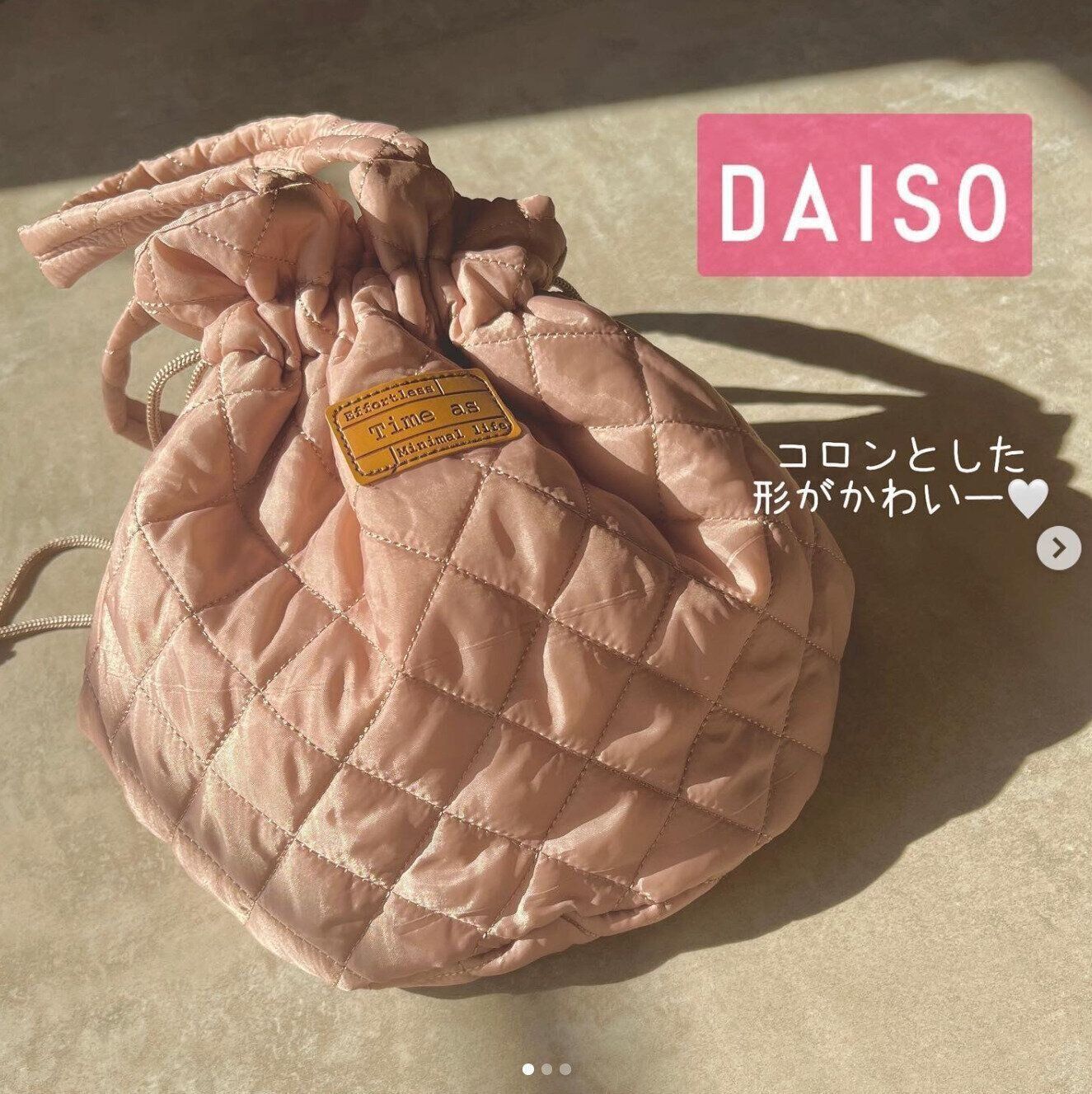 こちらはkm_mk_homeさんがダイソーで見つけた巾着バッグ。330円だったようですが、コロンとした形とキルティングに一目惚れだったそう。マチもしっかりあり思ったよりたくさん入りそうなんだとか♪ この方の行ったお店では最後の1個だったそうです。