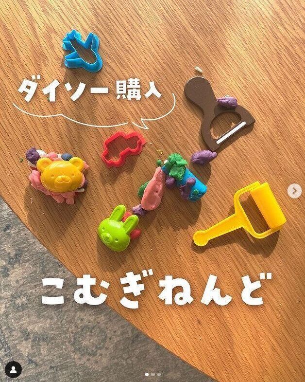 mahoさんのお子さんはダイソーの「こむぎねんど・型セット」で粘土遊びデビュー! こちらはローラー1個、ねんど7色、押し型2個、抜き型2個がセットになっているとのこと。内容がかなり充実していますよね! 粘土遊びはお子さんの成長に合わせてできることが変わっていくので、ママも見ていて飽きないんだそうですよ♪