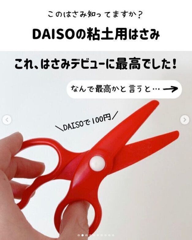 yunaさんはダイソーで粘土用はさみを購入。このアイテムのおすすめポイントは粘土用だから指を切る心配がないところ! お子さんがはさみを使い始めてまもなくは危なっかしくてひやひやするものですが、このはさみなら安心してたくさん使わせてあげられるそうですよ♪