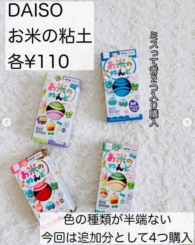 こさじママさんがダイソーでリピ買いしているというのがこちらの「お米のねんど」。原材料は米粉・水・塩分のみとシンプルなので、お子さんに安心して遊ばせてあげられるんだそう♪ 触り心地はねっとりしていてぽろぽろ落ちないところもgoodとのことですよ。