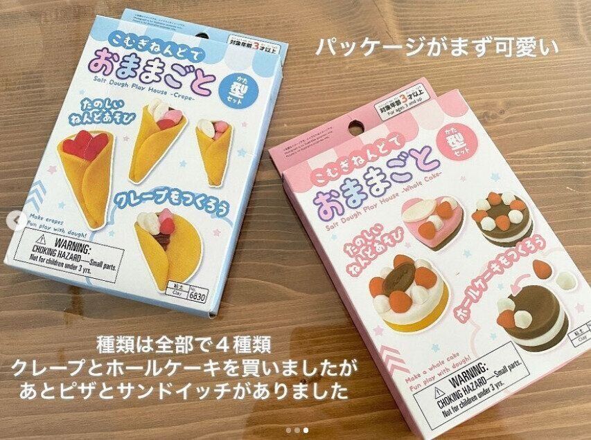 ダイソーで「こむぎねんどでおままごと」シリーズをGETしたmaiさん。こちらは型と小麦ねんど5色がセットになっていて、パッケージ通りのかわいいスイーツが簡単に作れるとのこと。粘土をこねて遊ぶだけになりがちだったというお子さんも、型があることでより楽しく遊べたそうですよ♪