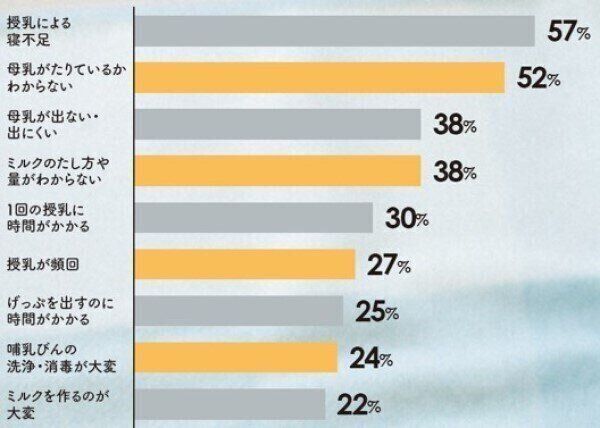 半数以上の人が、授乳による寝不足や母乳の量に関して悩んだことがある、と回答しています。ほかにも、母乳が出ない&出にくい、ミルクのたし方がわからない、などの悩みも多いことがわかりました。