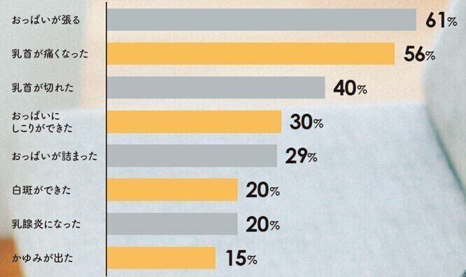 今回のアンケート調査の結果によると、産後0~4カ月に起きたおっぱい(乳首、乳房)のトラブルで多かったのは「おっぱいが張った」61%と、「乳首が痛くなった」56%。この2つのトラブルは、半数以上の人が経験しています。