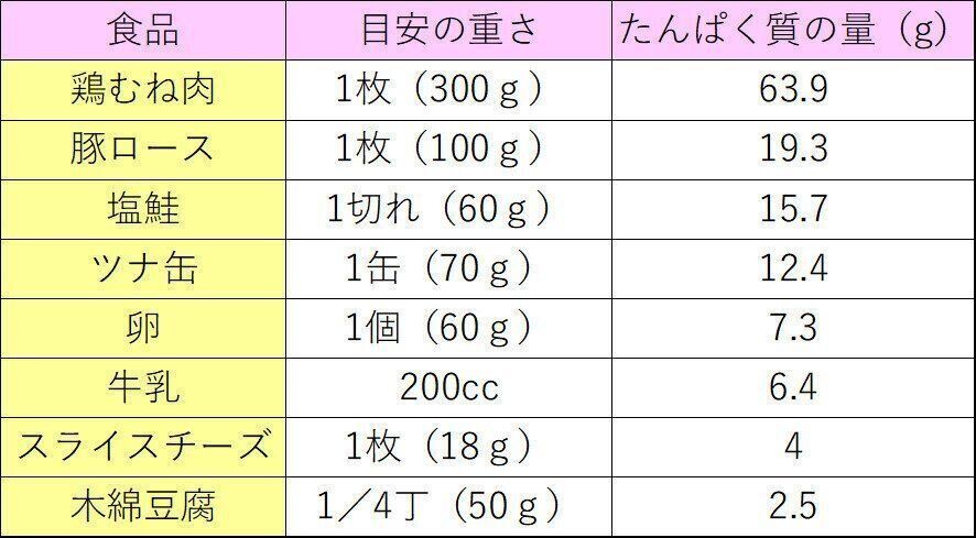 普段、よく使う食品に含まれているたんぱく質量は以下の通りです。