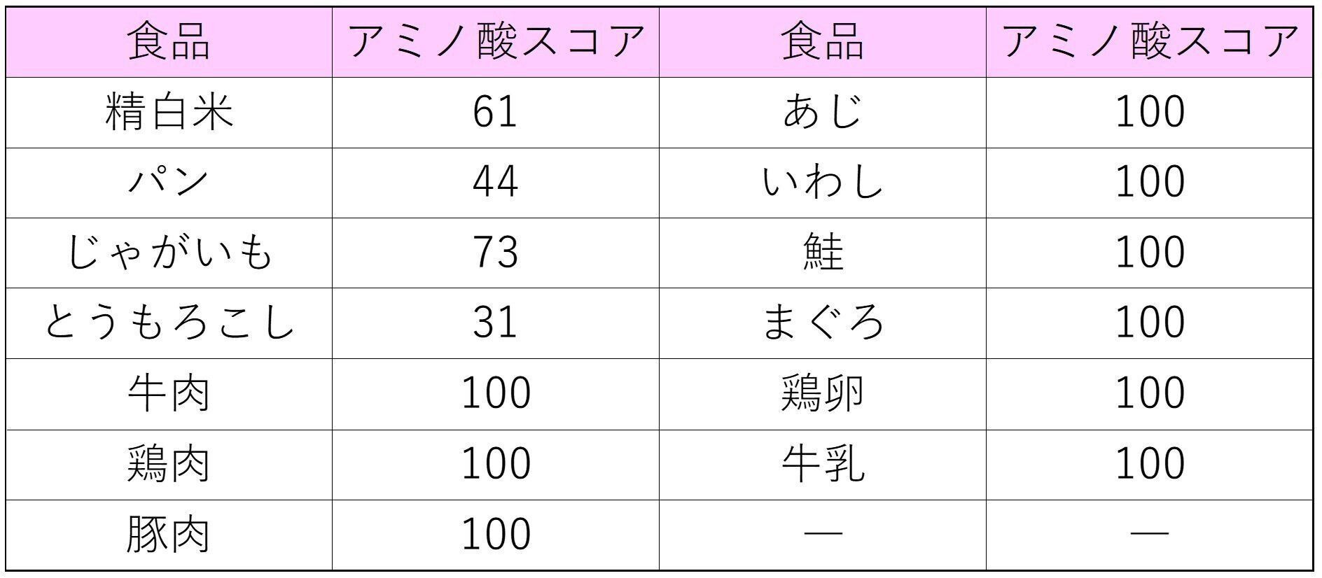 よく使う食品のアミノ酸スコアは以下の通りです。(※5)