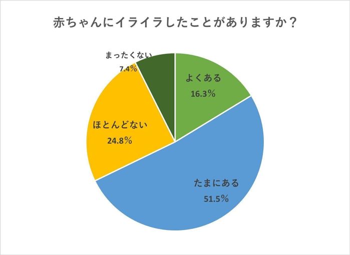 たまひよのインターネット調査によると、「赤ちゃんに対してイライラしたことがあるか?」という質問に対して、「よくある」「たまにある」と答えた人は計67.8%。約7割の人がイライラした経験があることがわかりました。逆に、イライラしたことが「まったくない」と答えた人は、全体の7.4%しかおらず、育児にイライラはつきものであることがわかります。