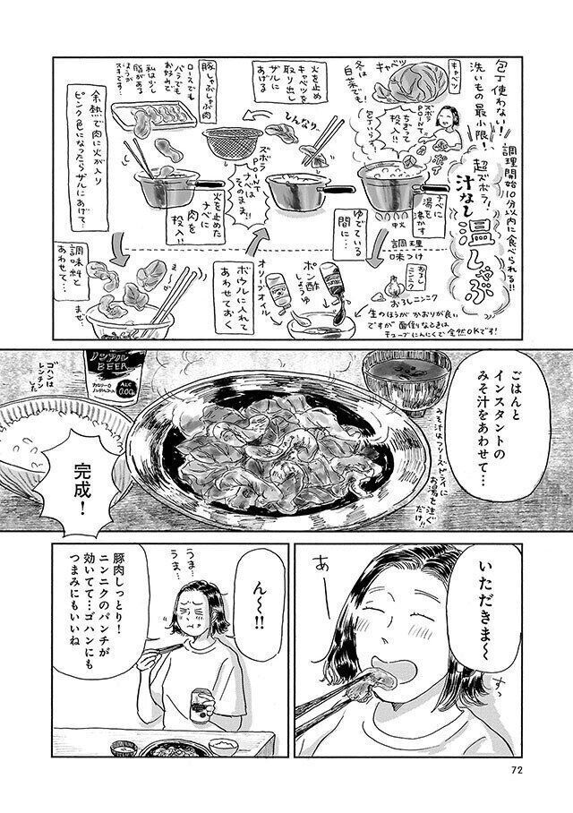 大町テラス「単行本の6話に描いた汁なし温しゃぶは簡単で野菜もたくさん摂れておすすめです。 葉物野菜としゃぶしゃぶ用の豚肉をさっと茹でてポン酢とおろしにんにく、オリーブオイルであえるだけ!食べるラー油や麻辣醤などで味変するのも楽しいです。