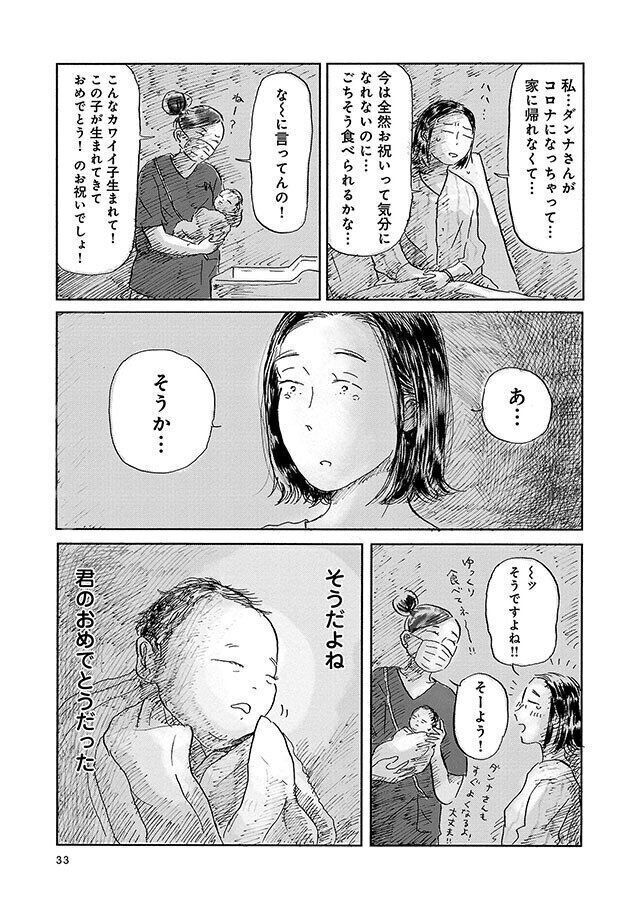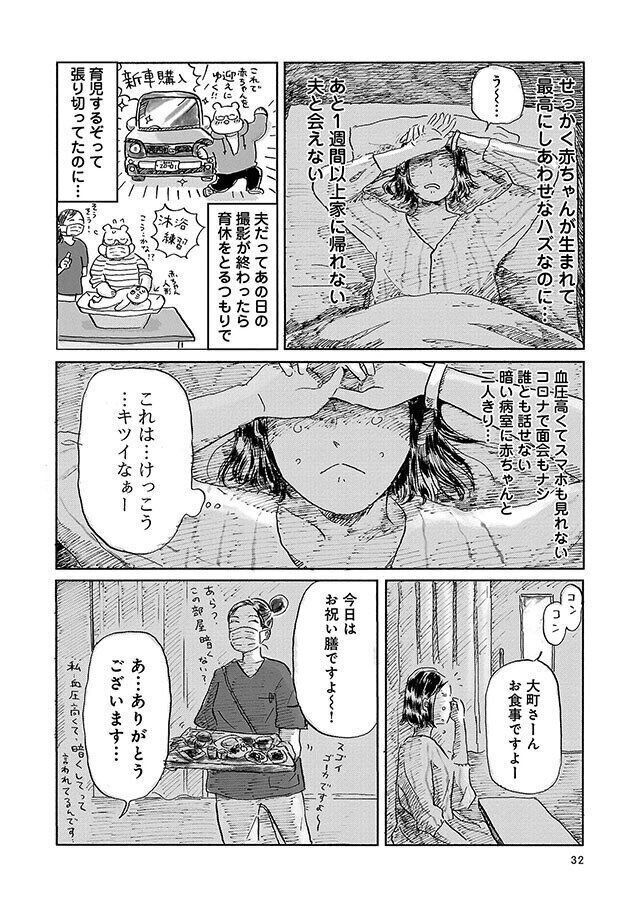 大町テラス「単行本に収録されている2話、3話にも描いたのですが、帝王切開で出産後3日目に夫からコロナ陽性だったという連絡が入りました……。『あと数日で退院して夫とこどもと待望の3人での生活がはじまるんだ』と期待していたところだったのですが一気にこの先の生活が不安になってしまいました。