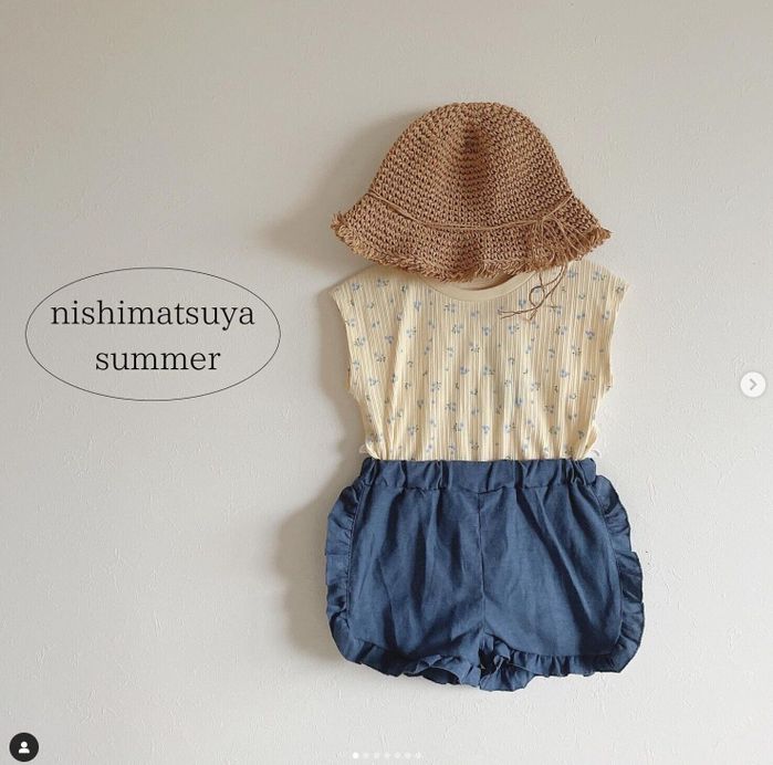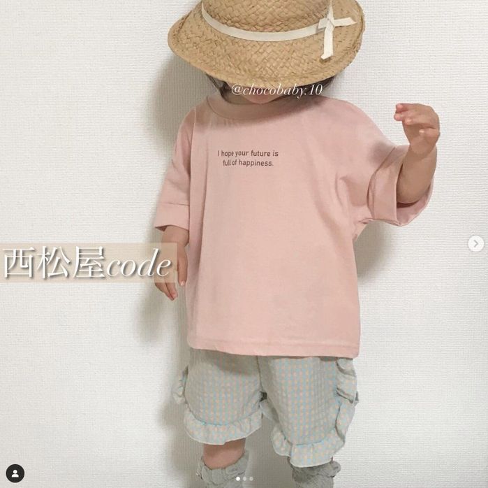 こちらはchocobaby.10さんセレクトの西松屋コーデ!「靴下以外、全部西松屋コーデ」とのことで、くすみカラーのTシャツと麦わら帽子の組み合わせがとてもおしゃれですよね!トップスのゆったりとしたシルエットもおしゃれなポイント♪