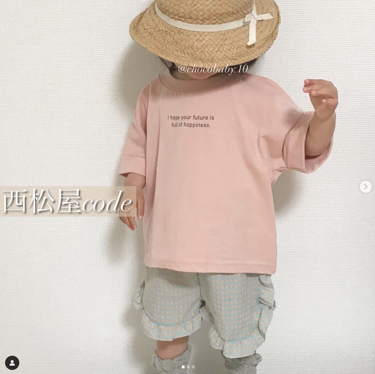 こちらはchocobaby.10さんセレクトの西松屋コーデ!「靴下以外、全部西松屋コーデ」とのことで、くすみカラーのTシャツと麦わら帽子の組み合わせがとてもおしゃれですよね!トップスのゆったりとしたシルエットもおしゃれなポイント♪