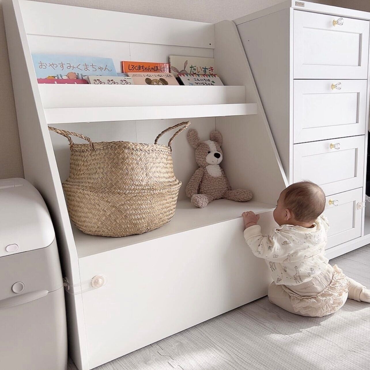 REIKAさんはIKEAで収納棚を購入したみたい。上段は絵本棚、その下はおもちゃなどをディスプレイしたりもできるみたい。画像のようにバスケットを置けば、こまごまとしたアイテムもすっきりとした印象になりますよね。