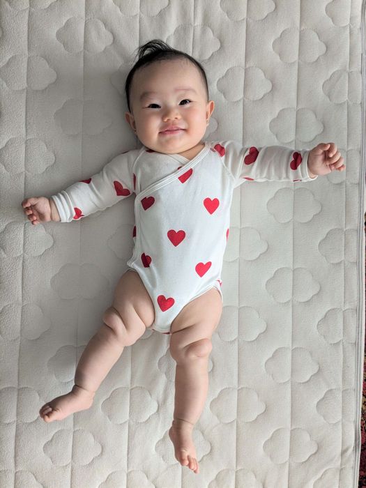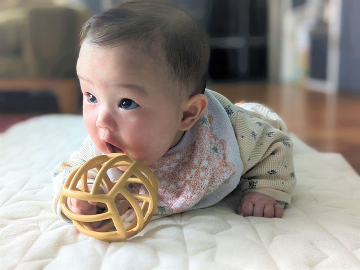 うつぶせで過ごす時間が増えたきた紬木(つむぎ)ちゃん。「もうすぐ寝返りできるようになるかな?」と、ママ・パパも楽しみにしています。