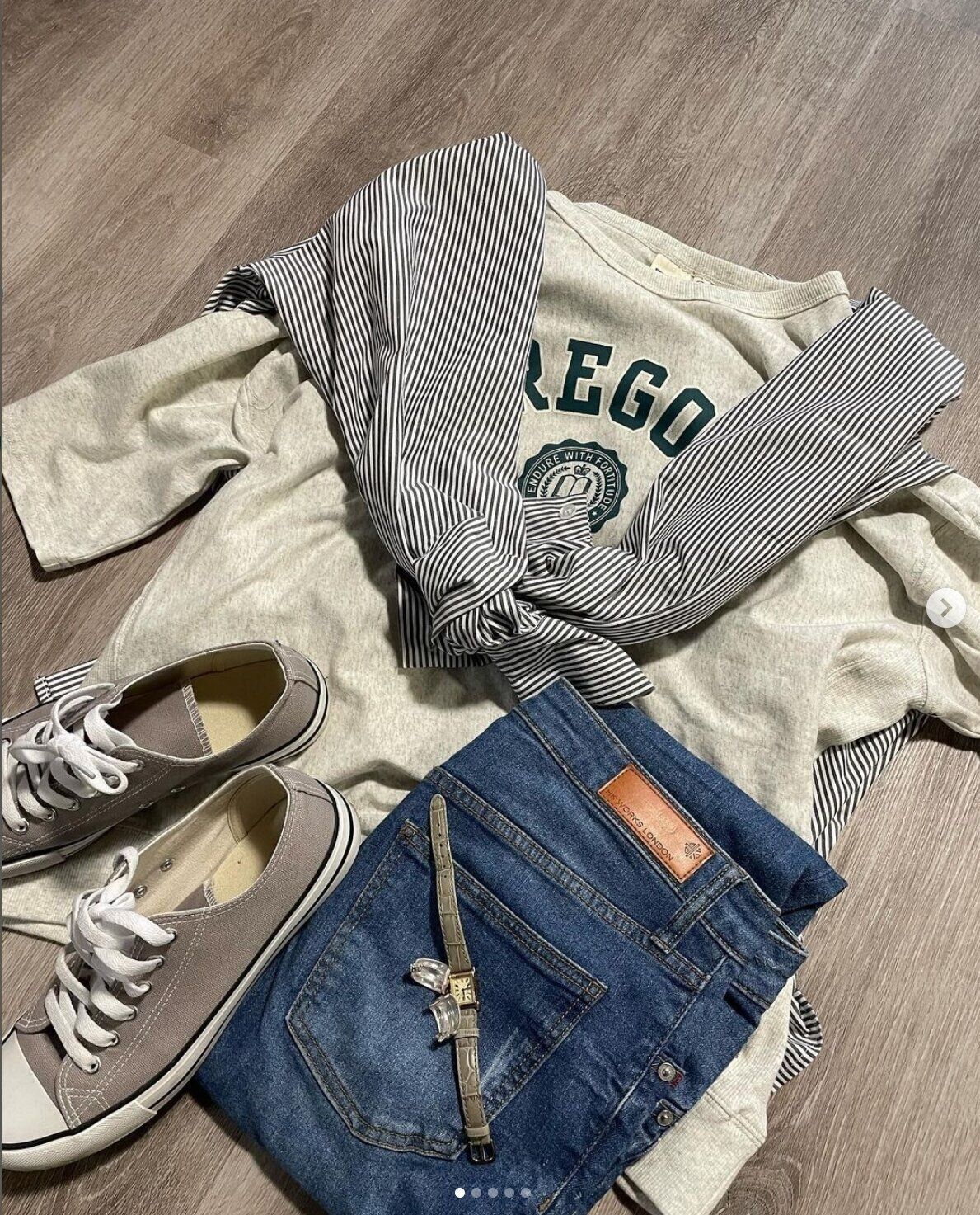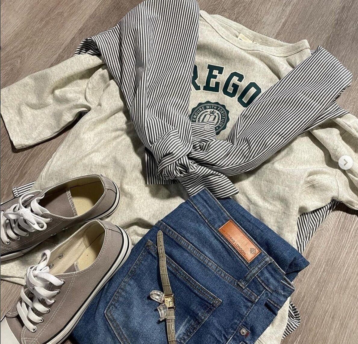 r3.mama.r3さんはストライプシャツで全身しまむらコーデ!シャツ・Tシャツ・デニム・スニーカーは全てしまむらで買ったそうで、プチプラとは思えない可愛さですよね。シャツはビッグシルエットで、身長165cmでLサイズを着るとお尻まで隠れるサイズ感だとか♪