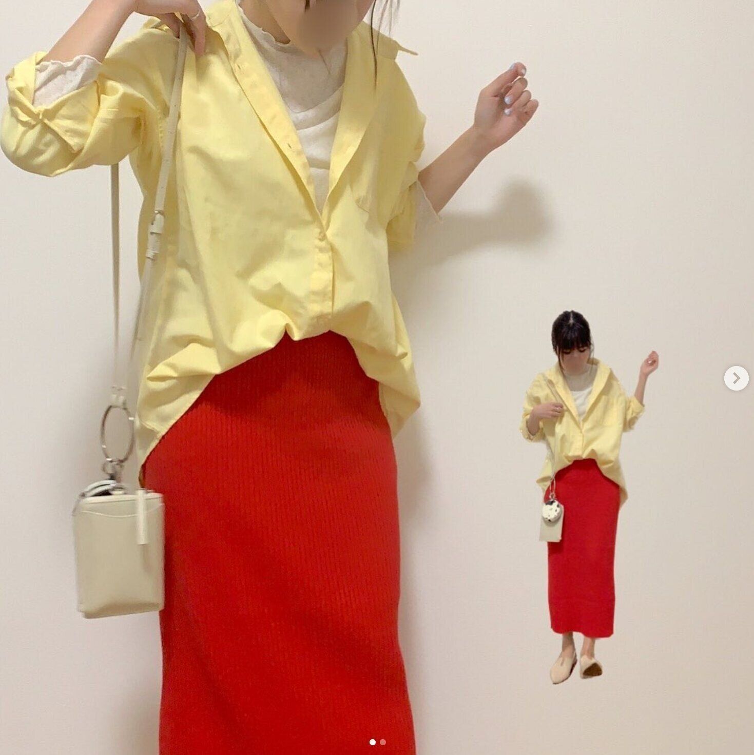 krurinkleさんはしまむらのオックスフォードシャツをコーデにセレクト!イエローのシャツに赤いリブニットスカートを合わせたそうで、「元気の出るカラーコーデ」を意識したんだとか♪ 着るだけで明るい気分になれそうなコーデですよね!シャツの価格は1,639円とのこと。