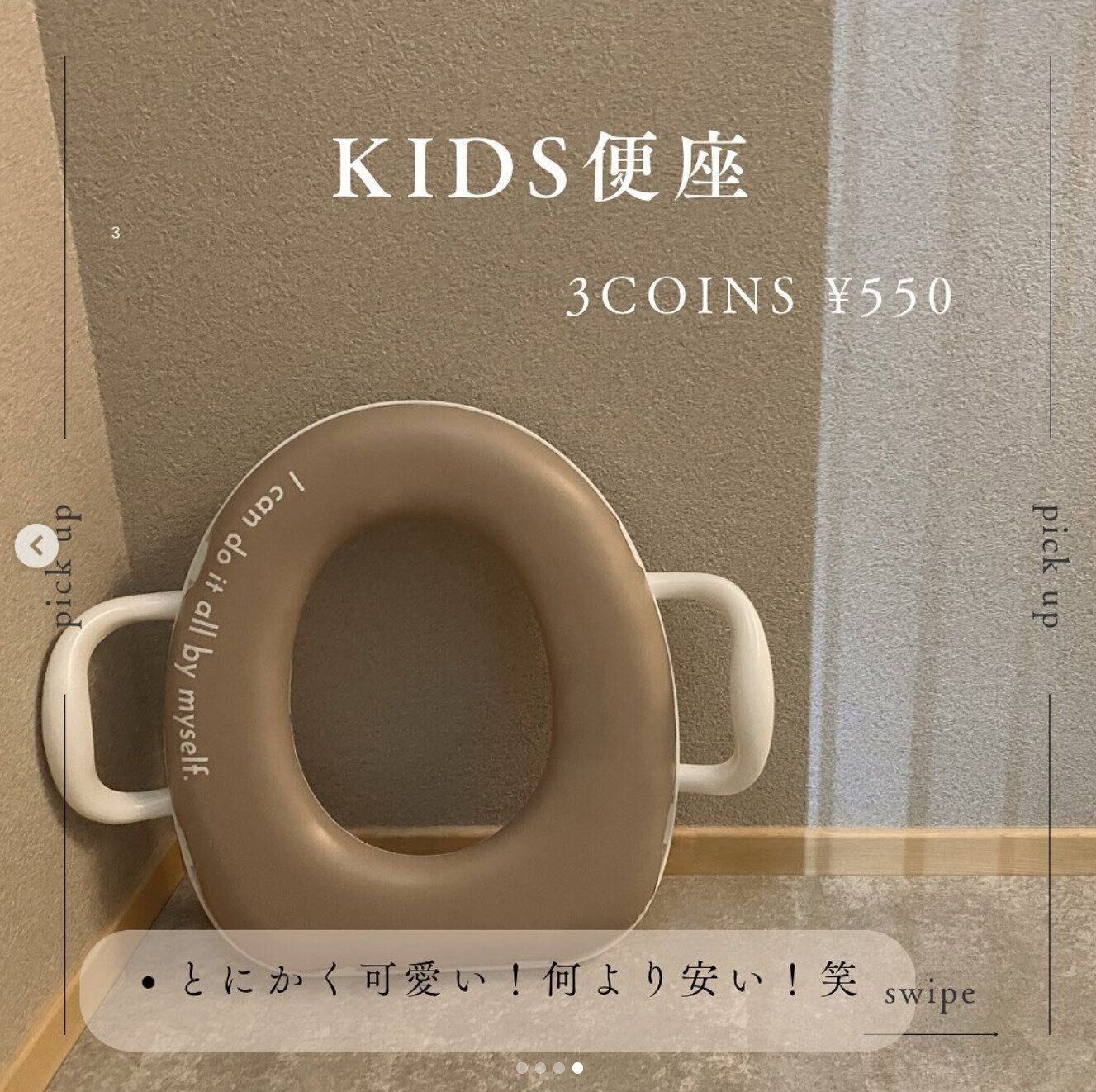 こちらはami_japandihomeさんが3COINSで購入したKIDS便座。トイレに置いても生活感が出ず可愛いのだとか。便座部分にはクッション性があり座り心地も良さそうとのこと。550円だったようですが、お値段も最高と大満足のようです◎