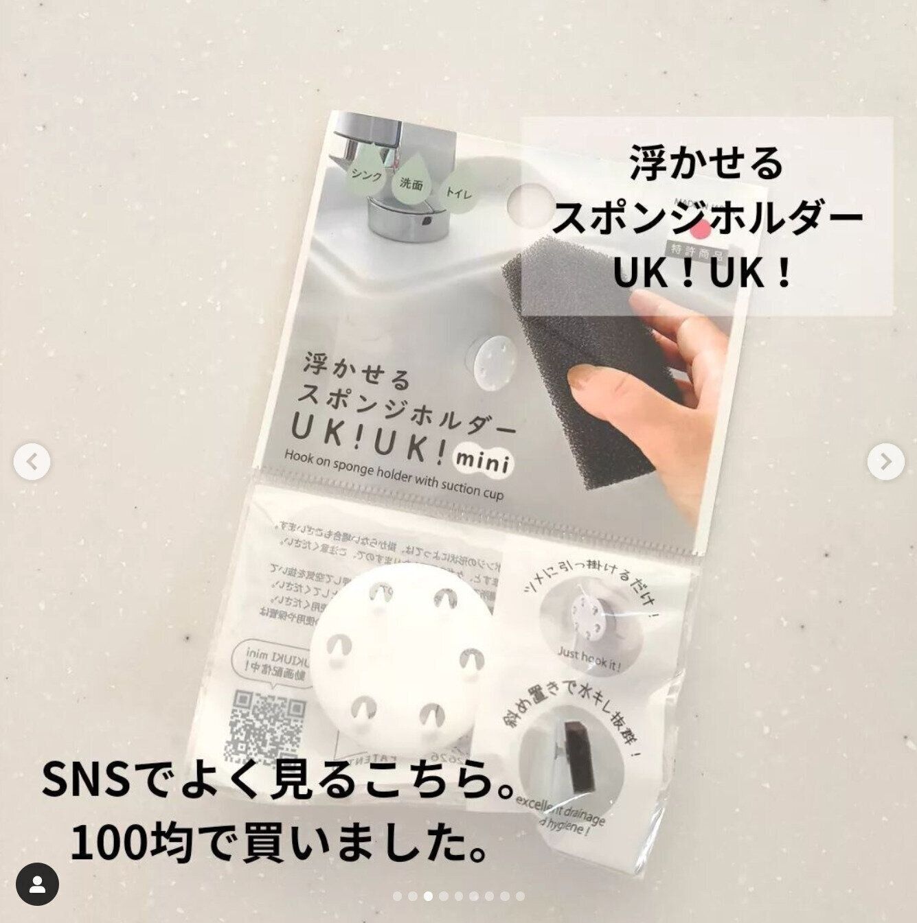 こちらは_yucca.homeさんがセリアで購入した「浮かせるスポンジホルダー UK!UK!mini」。シンクに吸盤で取り付けでき、ツメにスポンジを引っかけて浮かせておけるのだそう。省スペースで掃除もしやすくなり、コスパ最強と気に入っているようです♪