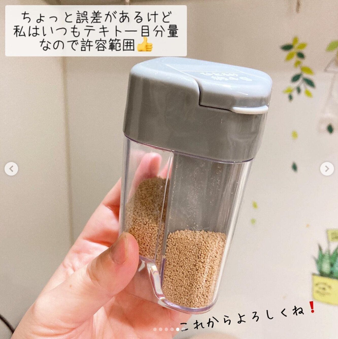 こちらはsakimokaroomさんがセリアで購入した「かんたん計量 粉末だしボトル」。容器の中に仕切りが付いており、ひと振りすると小さじ約1杯分のだしが出てくるようになっているのだそう。少し誤差はあるとのことですが、目分量と比べると味のばらつきが減りそう、と満足しているようです◎