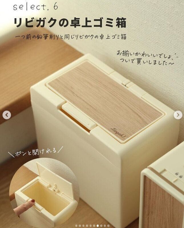 yokoさんはリビガクの卓上ゴミ箱を購入しました。ふたはワンプッシュでポンと開く仕様。木目調で出しっぱなしでもOKなデザインが素敵ですよね。同じシリーズの鉛筆削りとそろえて使うのも統一感があってかわいいそうですよ♪