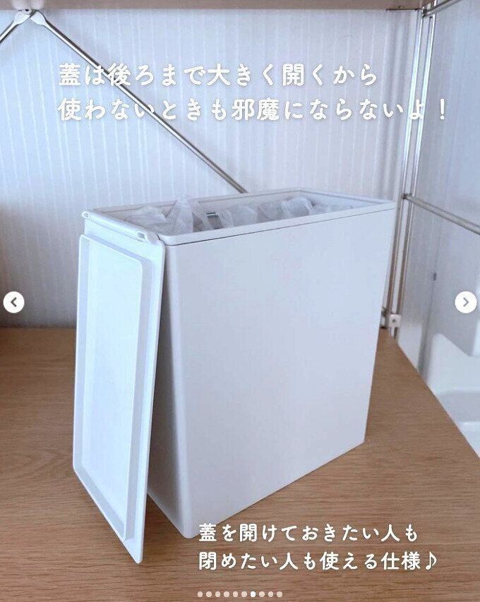 おさくさんは無印良品ですっきりしたフォルムが素敵な「ポリプロピレンごみ箱・角型・小」を購入しました。ふたは大きく開くので使わないときにもじゃまにならず便利なんだとか! 横幅約9cmとコンパクトなうえ、角型ですき間にフィットしやすいので「ここにゴミ箱があったらな~」を叶えてくれるそうですよ♪