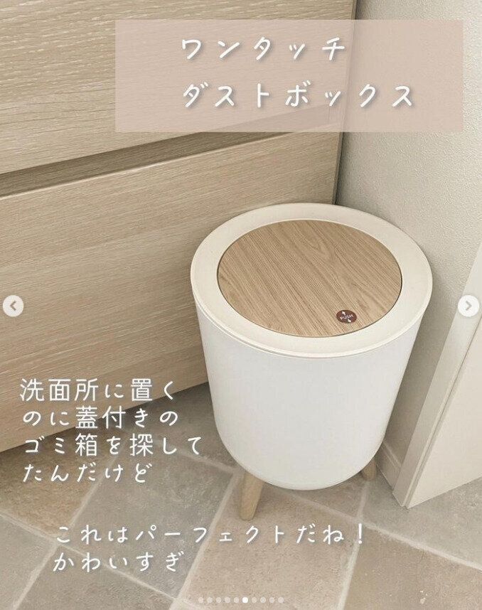 ミキティさんのおすすめは楽天で購入したというワンタッチダストボックス。木目調のふたに脚付きのデザインが「パーフェクトだね! かわいすぎ」とお気に入りの様子。ふた付きで中身が見えないので、生活感が出にくそうなところもgoodですよね!