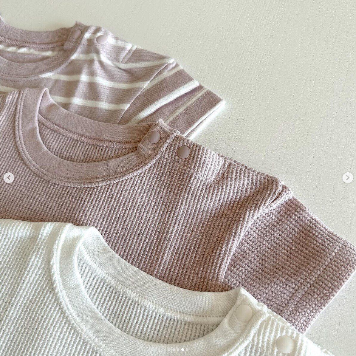 y____baby_さんは、各590円のボーダーTとワッフルTを購入。くすみピンクが可愛くて、こちらのTシャツをゲットしたんだそう。白は汚れるのがちょっぴり気になるけど、1枚590円ととってもお安いのでまとめて購入。Tシャツは何枚あっても使えますよね。