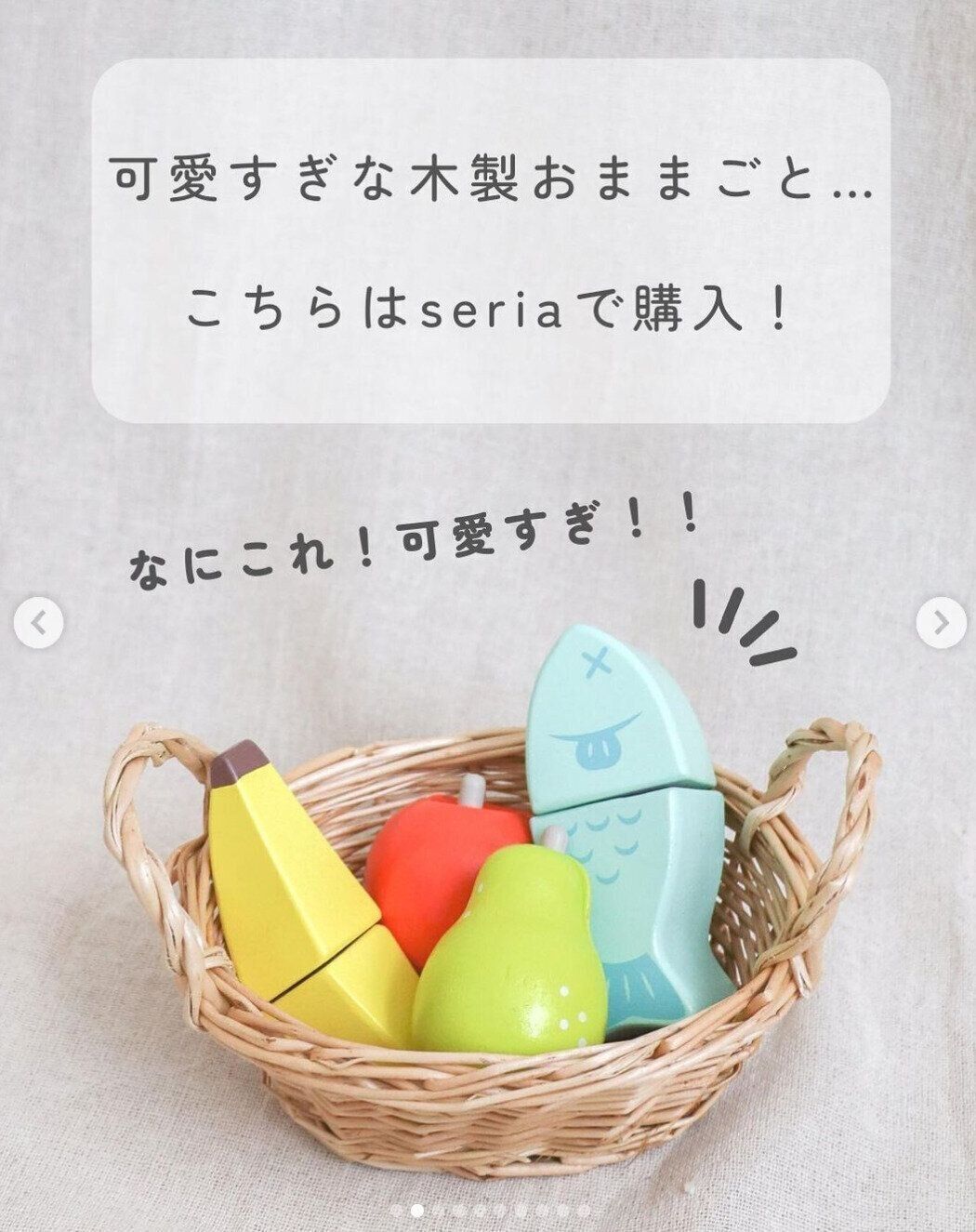 こちらは_nana_mumさんがセリアで購入した「木製おままごとシリーズ」のフルーツとおさかな。面ファスナーでくっついており切って遊ぶこともできるようです。1個110円とのことですが、可愛すぎるとお気に入りの様子♪ おままごと好きのお子さんにとってもおすすめとのこと。