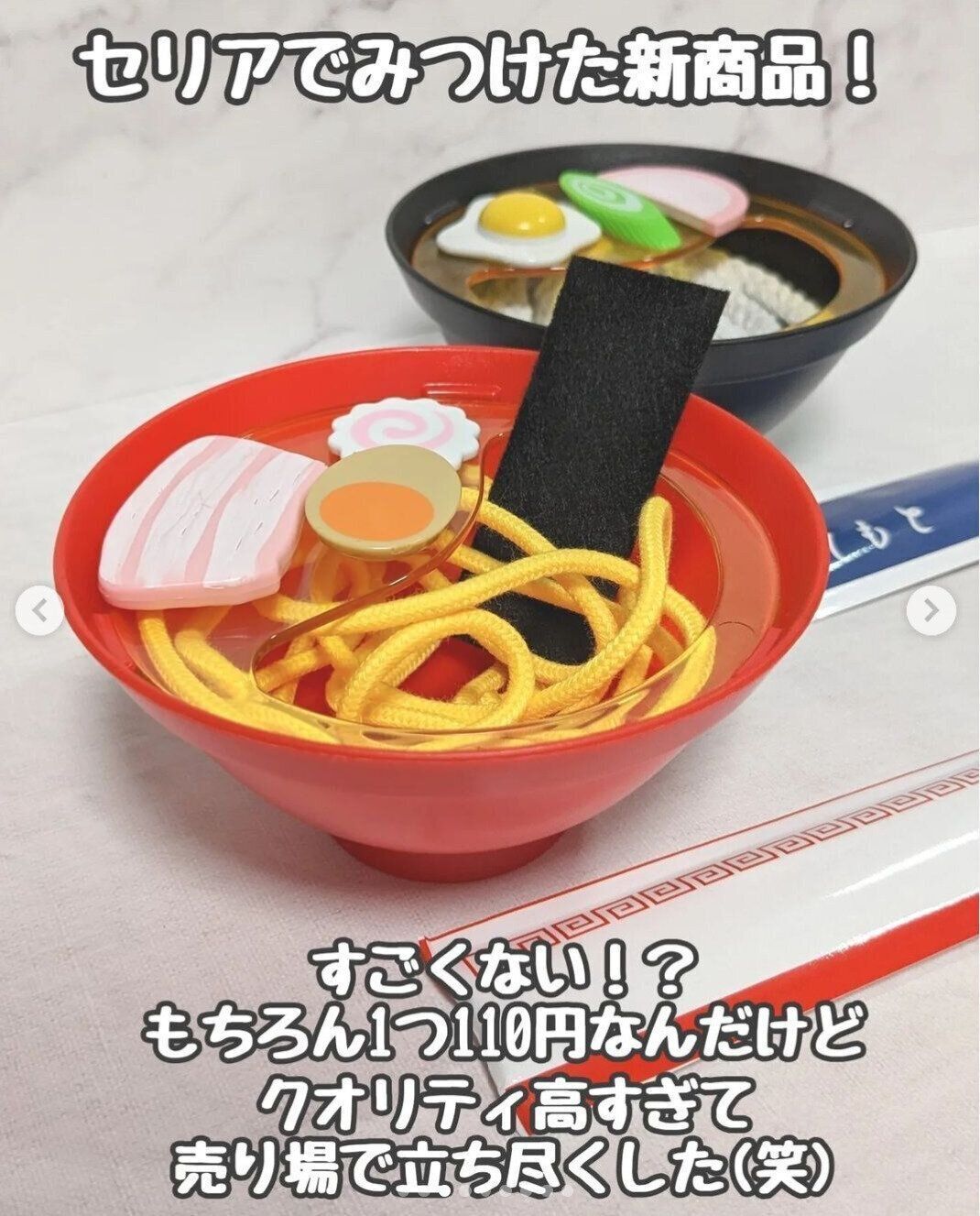 こちらはmaruteteteさんがセリアで購入したラーメン屋さんセット。麺に見立てた紐やトッピングの具材などがセットになっているそうです。具材が並べやすくラーメン屋さんごっこがさらに楽しくなりそうとのこと。うどん屋さんセットもあるようですが、どちらも驚きのクオリティなんだとか♪
