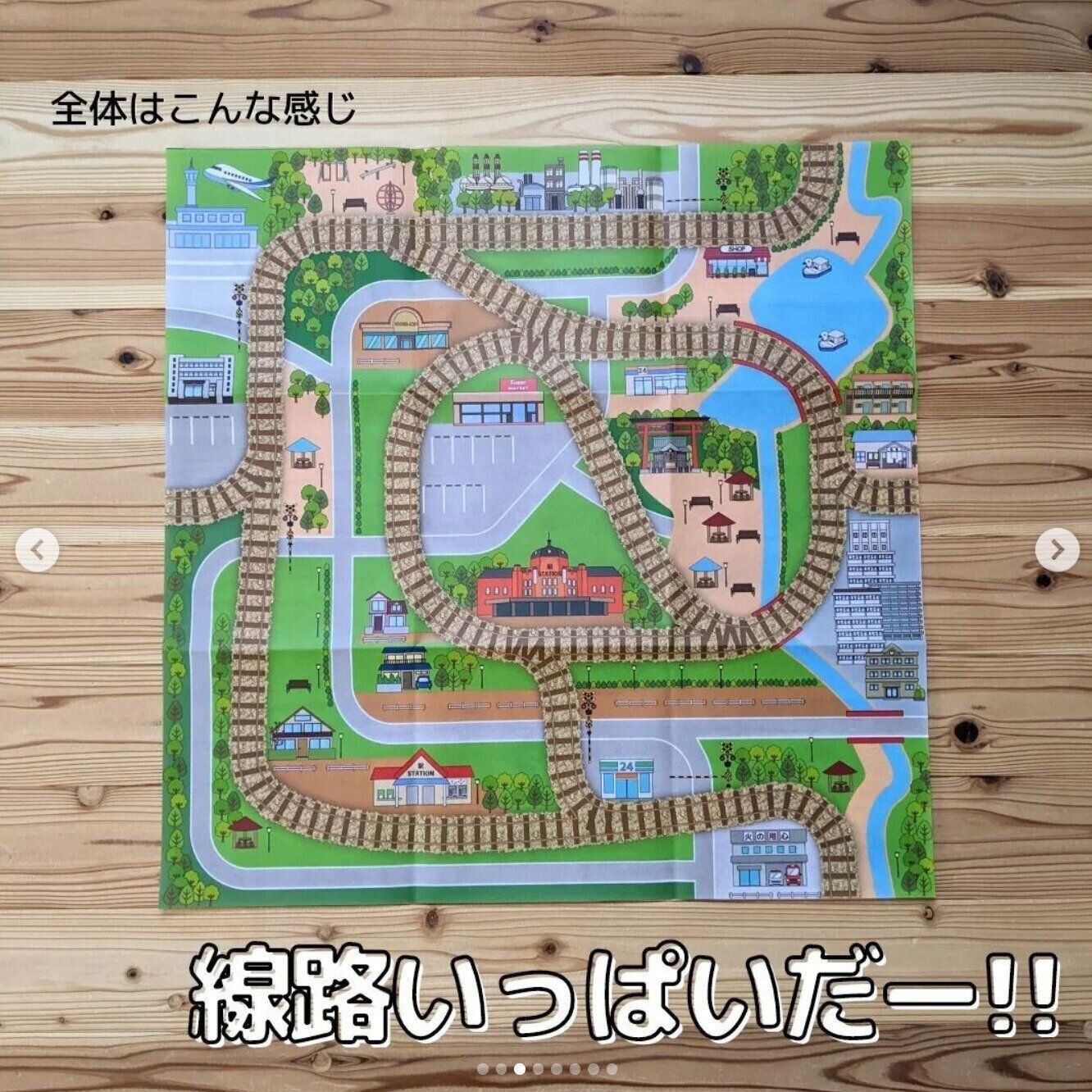 こちらはkote2.boyさんがセリアで購入した「レイルウェイマット」。線路や駅、踏切などが描いてあり、電車のおもちゃを走らせて遊べるようです。約70cm四方の大きめサイズとのことで、いろいろな遊び方ができそうですね♪