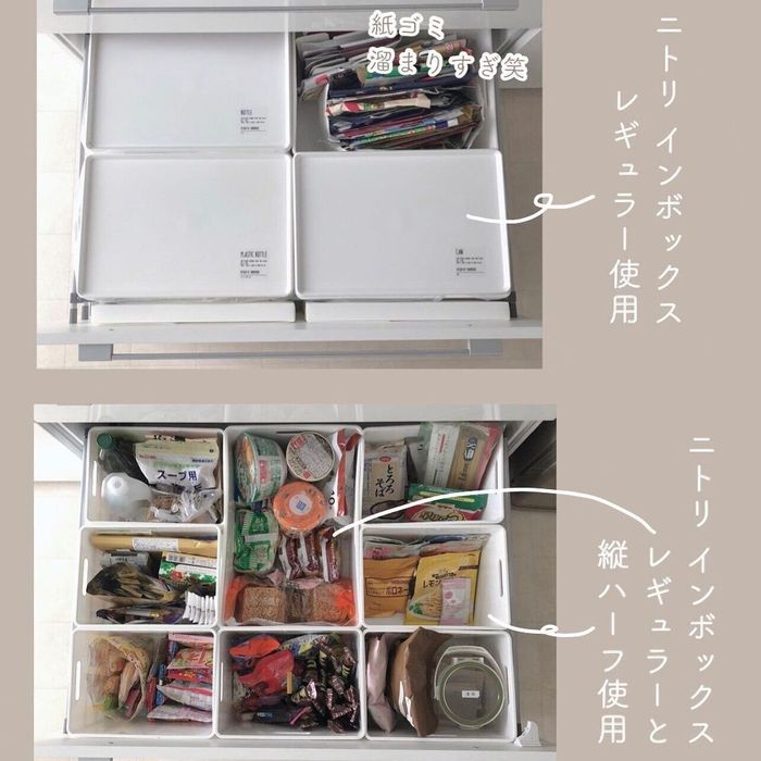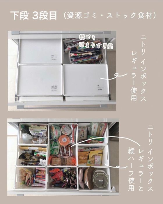 ドリさんはニトリのNインボックスでカップボードの引き出しを整理整頓したみたい。乾物・レトルト食品・インスタント麺などを仲間分けしてどこに何があるのかわかりやすく♪ パッケージの紙ごみ置き場も用意しておけばごみ捨ての無駄が省けて便利そう!