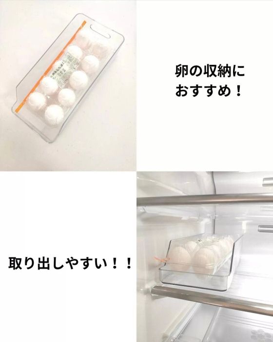 ゆっかさんはニトリで冷蔵庫収納用のトレーを購入したんだとか。こちらは缶ジュースをストックするのに便利なアイテムのようですが、それを卵収納として活用!卵パックをそのまま冷蔵庫に入れておくよりも安定して取り出しやすいみたい。