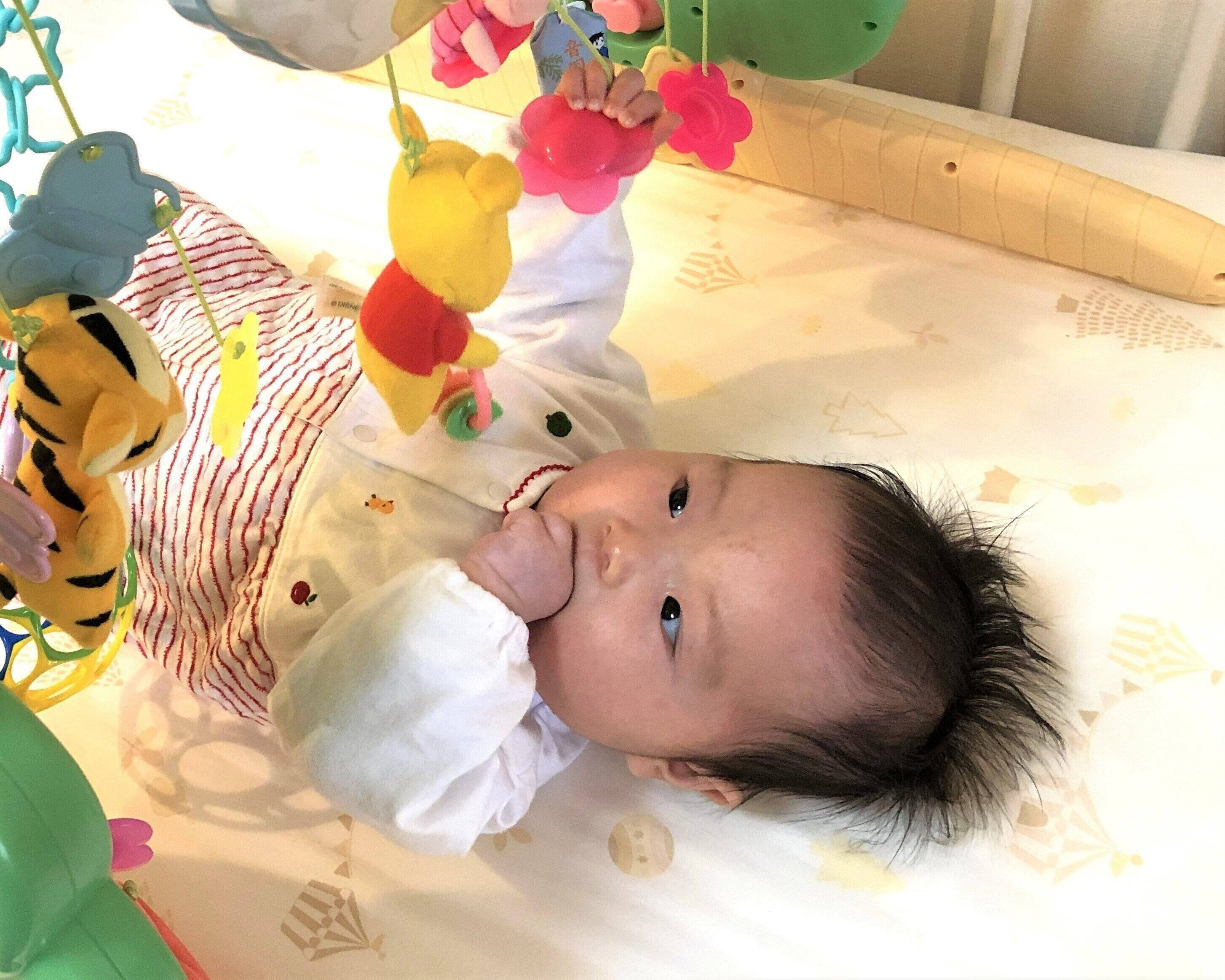 日中に起きている時間もさらに長くなり、一緒に遊ぶ時間も増えました。触れ合い遊びをしていたら楽しかったのか「キャッキャ!」と初めて声を出してくれ、私もパパもかわいい声にメロメロでした!