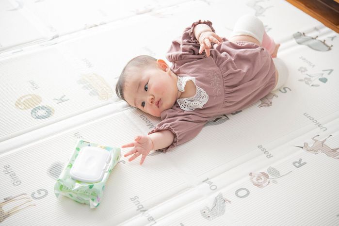今まで日中はベビー布団をリビングに敷いて遊ばせていたのですが、うつぶせで体を回転させたり、寝返りに向けて体をひねったりと、布団では手狭になってきたので、大きめのマットを購入しました。
