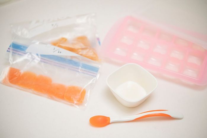 離乳食に使う10倍がゆやにんじん、かぼちゃ、ほうれん草などの野菜のペーストはフリージング。食材の数が増えてきたら、ベビーフードも使ってみようと思っています。