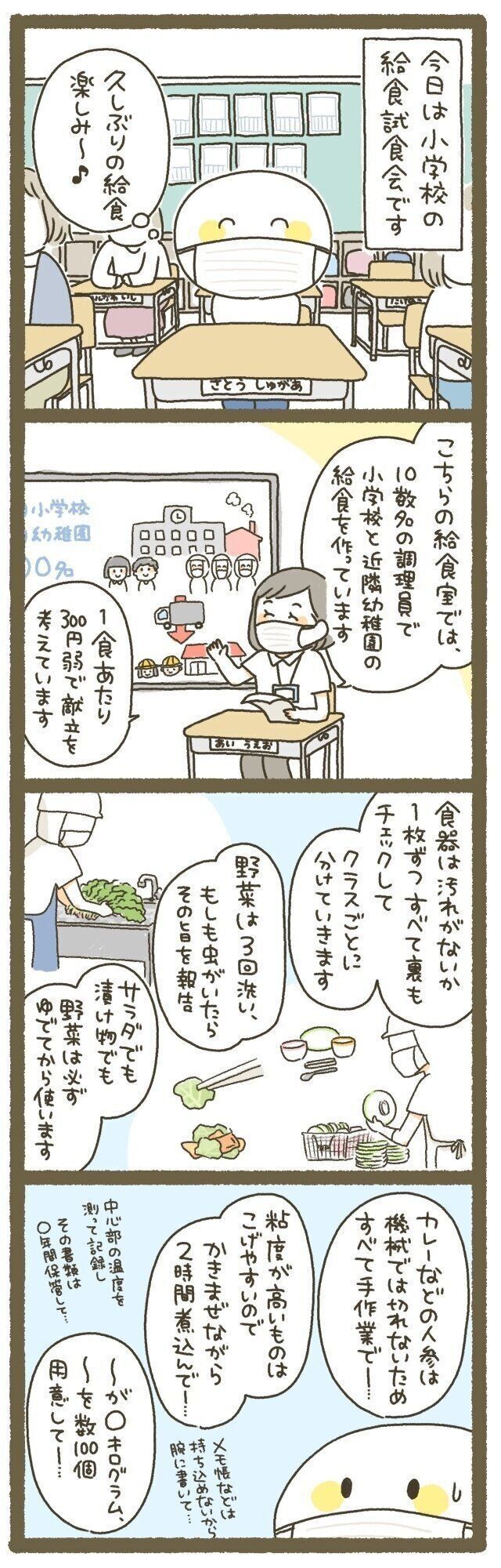家庭料理ならちょっと虫がついてたりお肉が生焼けだったりしても「あらやだ、ごめんね」程度で済むけれど、給食だとそうはいかないから気も使うし手間もかかる…!