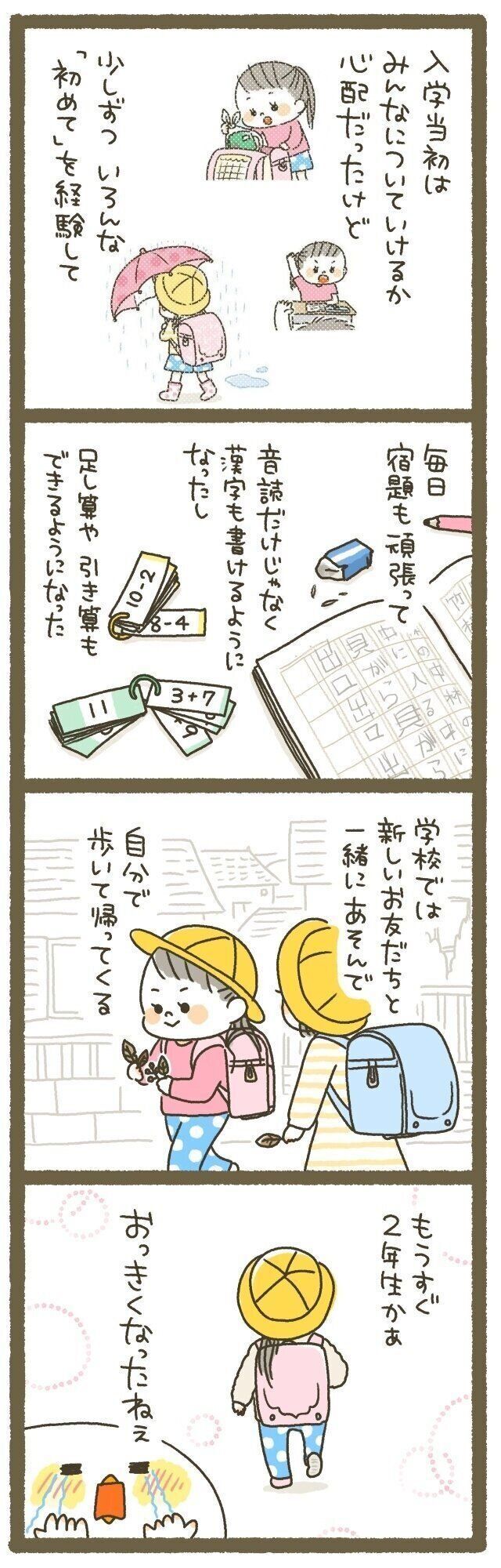 あ、当の本人はもうすぐ2年生になることよりも7歳になることのほうが楽しみらしく、「みーちゃん、もうすぐ7歳になるのよ」とうれしそうです。