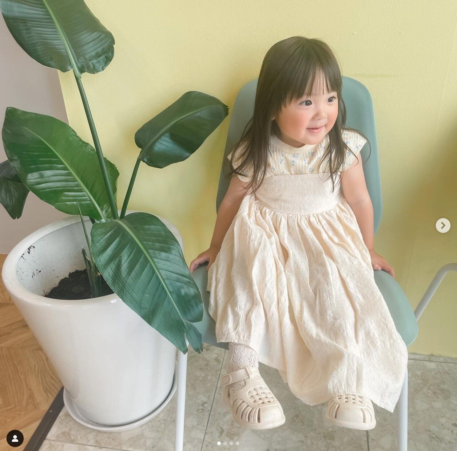 mamiさんは西松屋のトップスを使って夏コーデ♪ パステルカラーのトップスにワンピースを合わせたそうで、ふんわりとした雰囲気になっていますよね。リブ素材の立体感もおしゃれなポイント♪