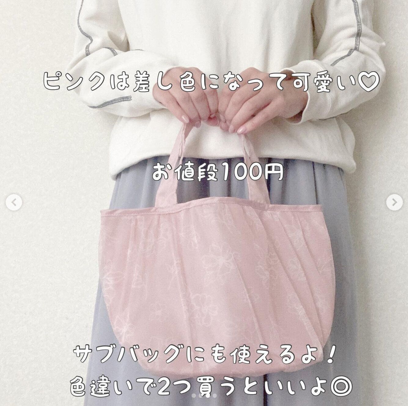 こちらはmaimaipapipuさんがセリアでゲットしたチュールミニトートバッグ。花柄のレースがとっても可愛くて110円には見えないのだそう。大きすぎず小さすぎないサイズ感でちょっとしたお出かけに重宝しそうですね!色違いのグレーも購入したとのこと。