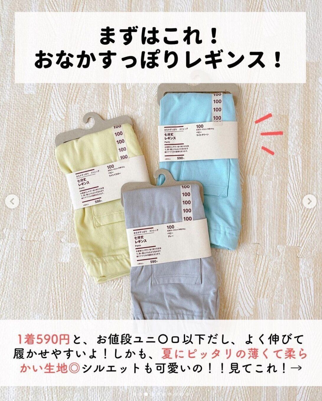 kazuyo_mommy25さんは無印良品でレギンスを3色買い!価格はそれぞれ590円で、よく伸びる生地なので子どものおなかまですっぽり収まるのがポイントなんだとか!値段もデザインも履かせやすさも希望通りで、「全て素晴らしくて感動した」とのこと♪