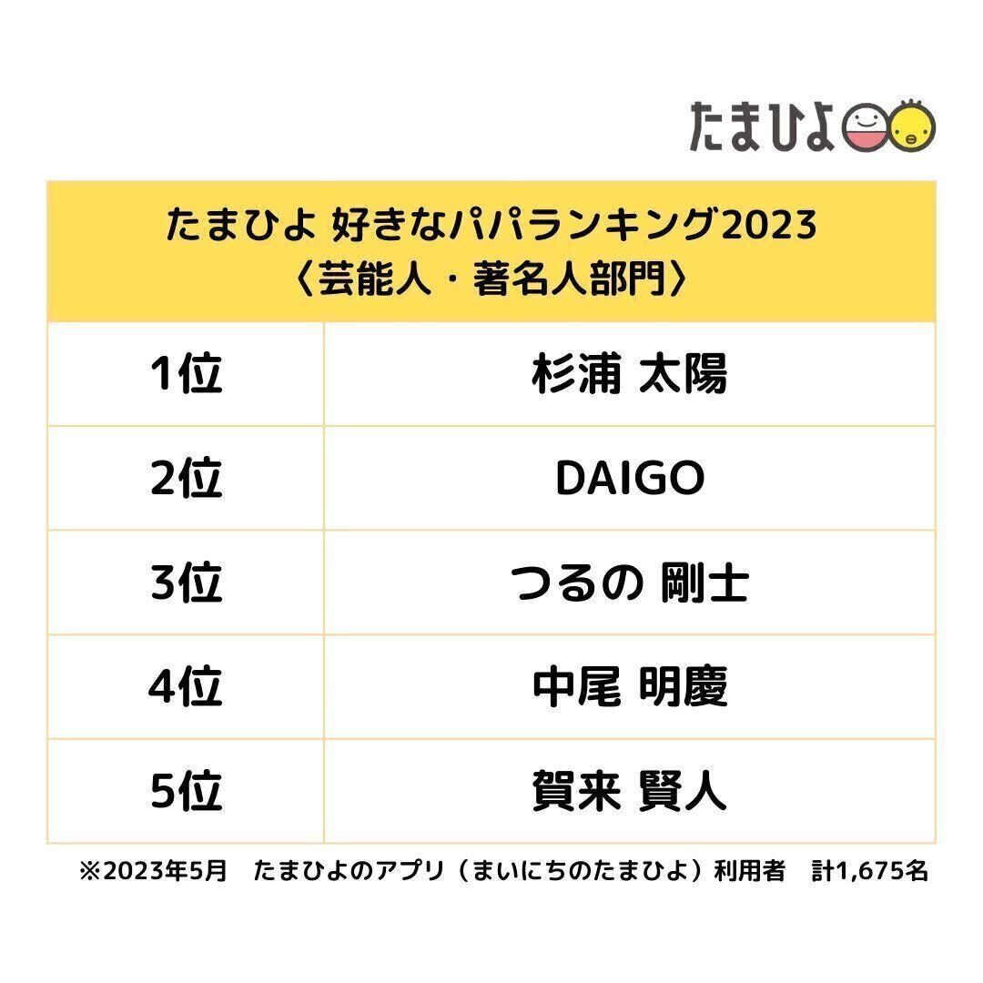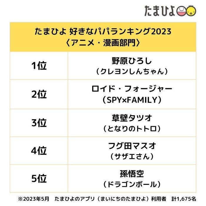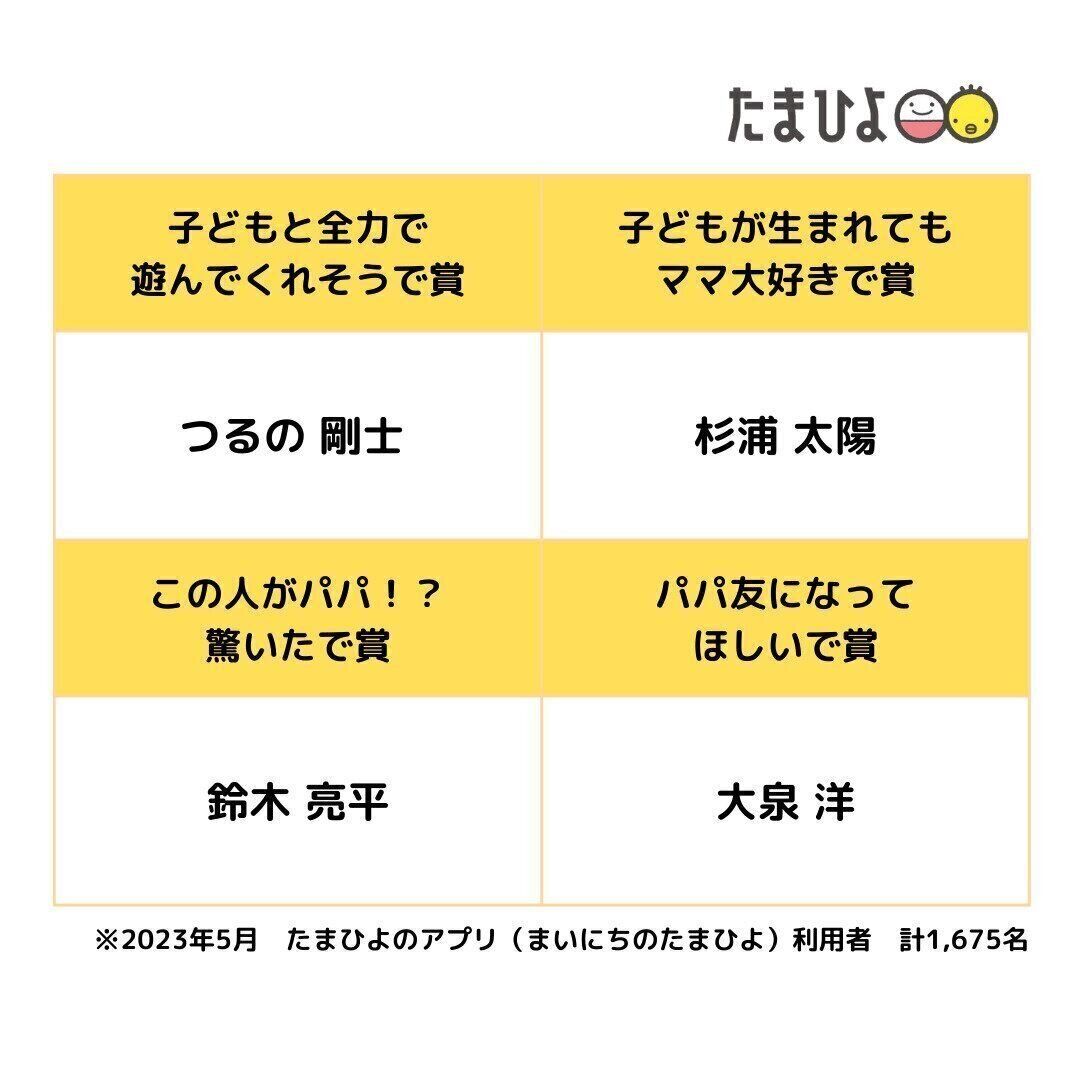 株式会社ベネッセコーポレーションの妊娠・出産・育児事業を展開する「たまひよ」は、6月19日(日)の父の日にちなみ、たまひよのアプリ「まいにちのたまひよ」利用者の男女1,675人を対象に実施した「たまひよ 好きなパパランキング2023」を発表しました。