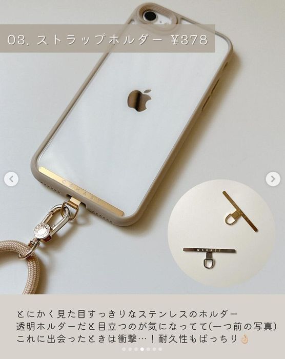 こちらはみーさんが楽天で購入したストラップホルダー。透明のものより目立ちにくく、見た目がすっきりするのだそう。ステンレス製で耐久性もばっちりなんだとか!1個378円とのことですが、高見えしていておしゃれですよね。
