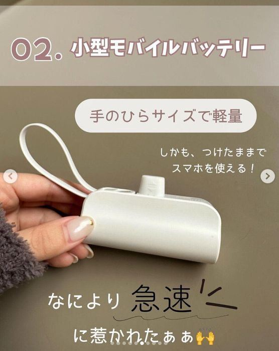 こちらはmochiko_benriさんが楽天で購入したモバイルバッテリー。手のひらサイズで軽く、スマホを約1~2回充電できるのだそう。とくに急速充電に対応している点に惹かれたんだとか。内蔵されている棒を出せばスタンドとしても使えるとのこと◎