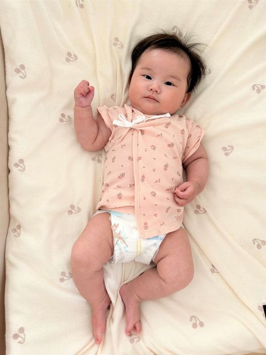 首がしっかりしてきて、抱っこしたときやうつぶせにしたとき、首を持ち上げてきょろきょろするように。まわりに興味が出てきたのかな? 最近は私に寄りかからせて、たて抱きふうに体を起こすことも。もうすぐたて抱きもできそうです。
