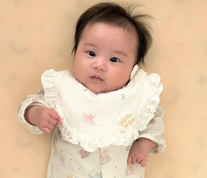 3カ月を迎え、よだれが増えてきた莉緒(りお)ちゃん。生後100日のお祝いに家族でお食い初めをして、スタイも使い始めました。