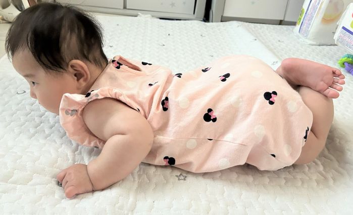 以前は、うつぶせにすると首を持ち上げられませんでしたが、私がすぐそばで見守りながら何度か練習しているうちに、持ち上がるように。