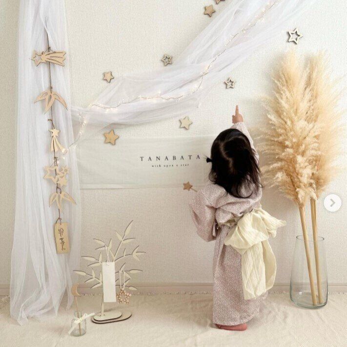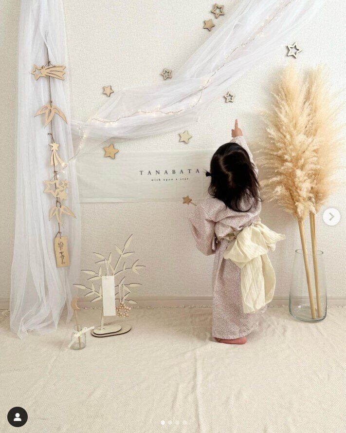 aiさんは、七夕フォトを撮ってみたんだそう。ライトアップもして、お子さんもきらきら星を歌ってノリノリだったんだとか。アワンズのタペストリーやそのほかの小物も色味が統一されており、シンプルでおしゃれ!マネしたくなるインテリアですよね。