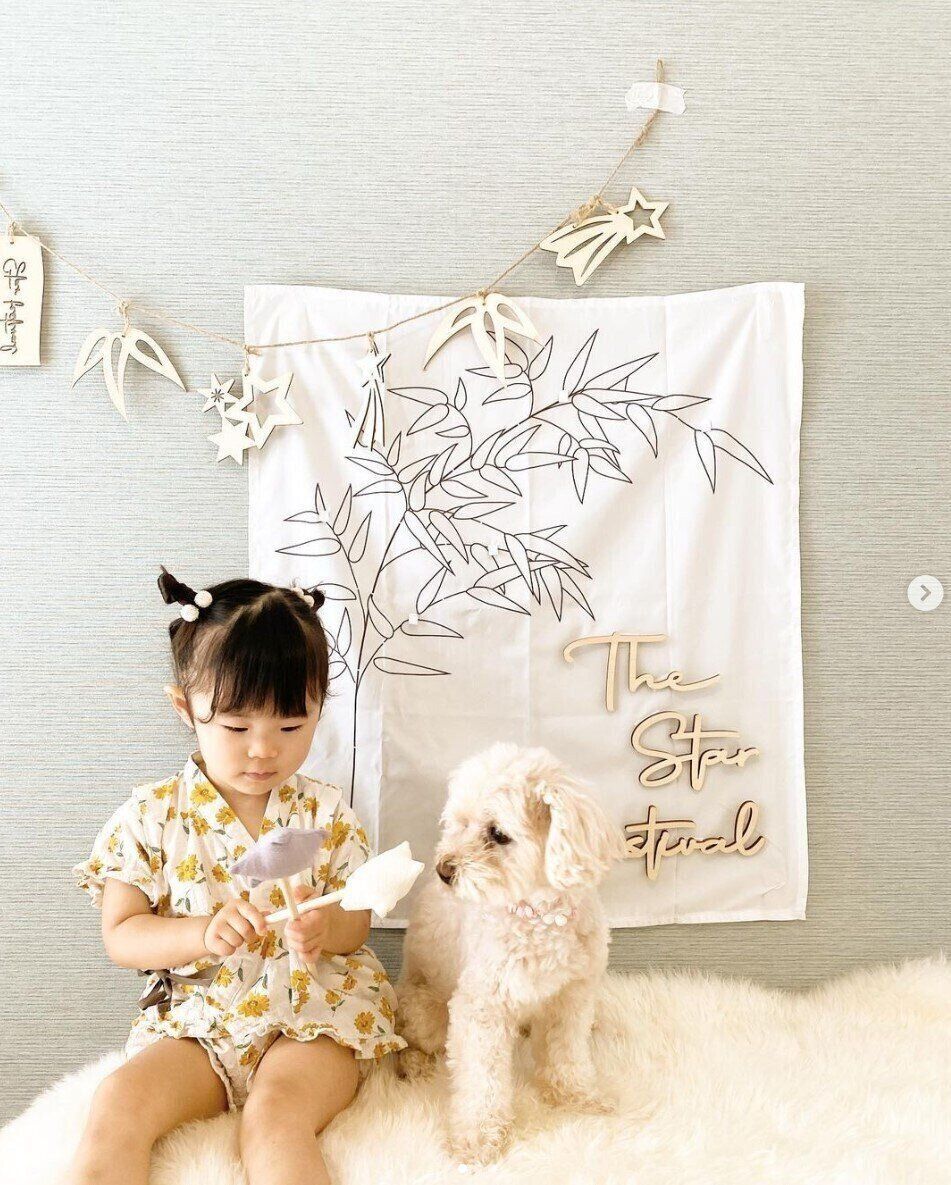 Usagiさんは、こちらの七夕飾りを。ガーランドやタペストリーなど、可愛らしいアイテムであふれていますね。甚平は、昨年着せたときはぶかぶかだったけど、今年はちょうど良いサイズだったんだとか。娘さんもワンちゃんも星のステッキに興味しんしんですね♪