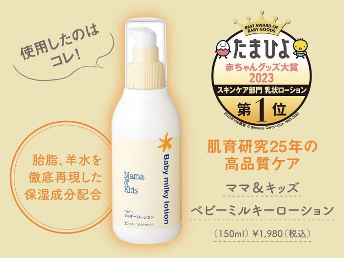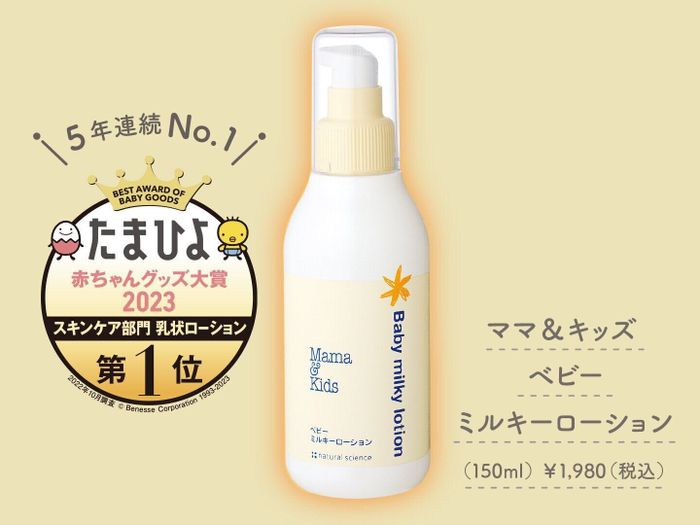 「ママ&キッズ」のベビーラインは、一度使うとその品質に納得して、リピートする人が多数。とくに、ママ&キッズを代表する人気アイテム「ベビーミルキーローション」は、たまひよ読者のママ・パパが選ぶ、「たまひよ赤ちゃんグッズ大賞」で5年連続で1位を受賞。多くのママ・パパから支持を集めています。