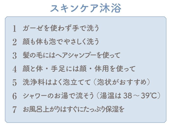 たっぷりの泡で、ガーゼなどは使わず、ママ・パパの手でこすらずやさしく洗って。泡を流すときは、38~39℃の熱すぎない湯を使うのが、肌を乾燥させないポイント。