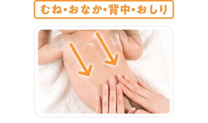 こすらずにすーっとやさしくのばします。首からおしりにかけても同様に。おしりは肌トラブルを起こしやすいので、シワの奥までしっかり保湿を。